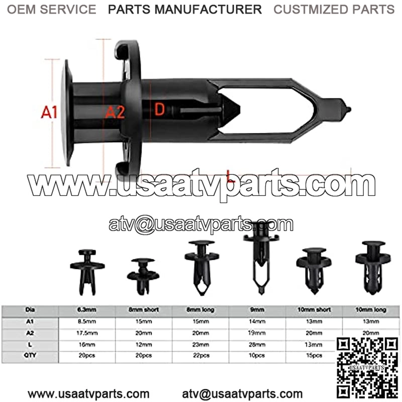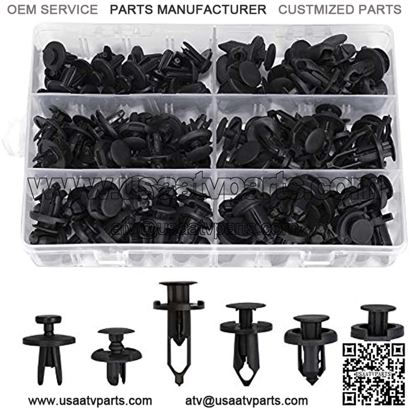 About this item Frosted finish, unreflective surface. 4 hole sizes from 6.3mm(1/4″), 8mm(5/16″ ), 9mm(23/64″ ), 10mm(25/64″ ). 6 different push pin rivet for ATV & many brand vehicles. Great for Door Trim, Car Fender, Bumper, Side Skirt, Radiator Shield, Splash Shield Retainers All packed in a plastic container for easy organization and storage. 260pcs car clips