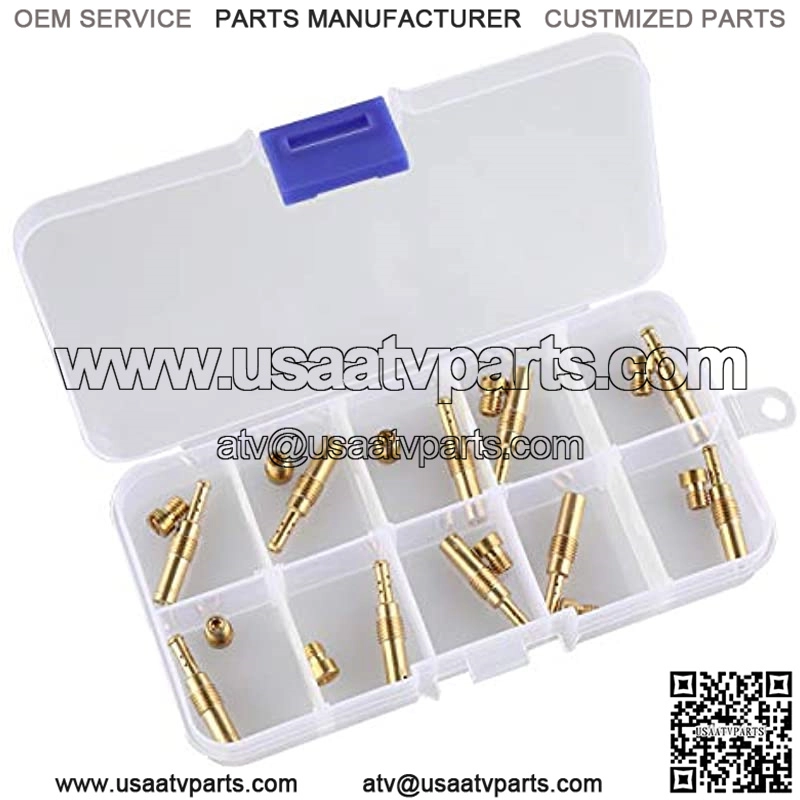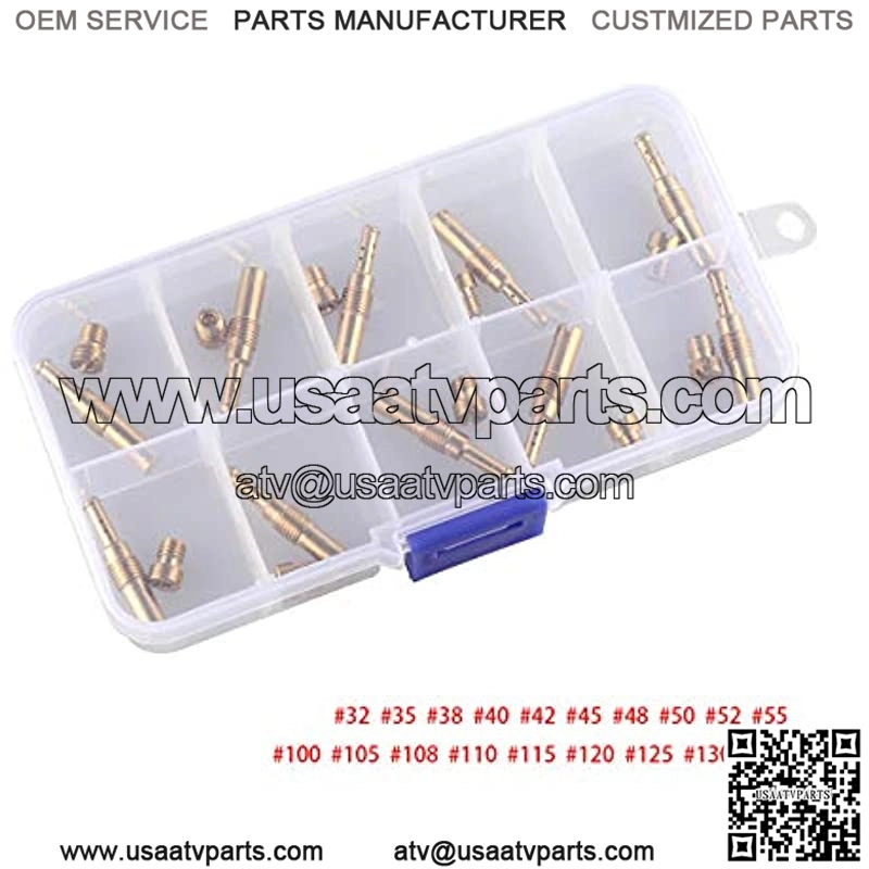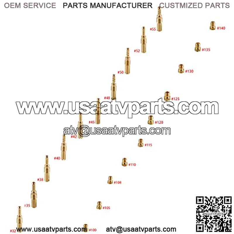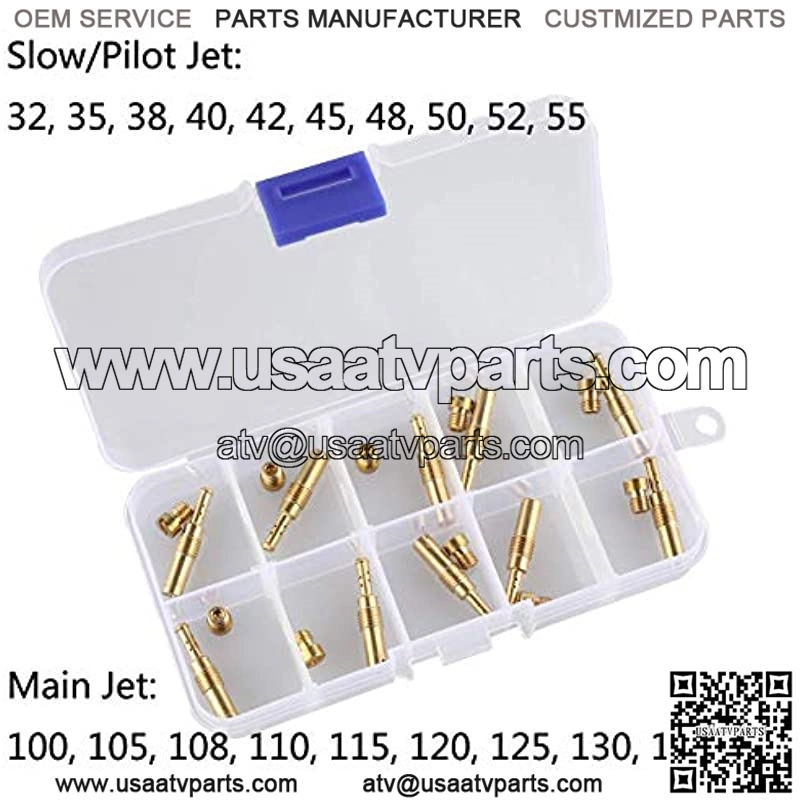 Package include: 10 pcs Carburetor Main Jets &10 pcs Slow/Pilot Jets.Fit most scooters, ATVs, and Karts with 125cc,150cc 200cc 250cc GY6 motors Carburetors, Packed in a small plastic case. Please check our photos and make sure the part shown looks identical to your stock one.Carburetor main jets for KTM KAWASAKI SUZUKI YAMAHA ATV Pit dirt bike Etc10 pcs Slow/Pilot Jet: #32, #35, #38, #40, #42, #45, #48, #50, #52, #55 Thread Size: M6x0.7510 pcs Carburetor Main Jet: #100, #105, #108, #110, #115, #120, #125, #130, #135, #140 Thread Size: M5x0.80 Overall Length: 8mm Thread: M6 x 0.75mm 28mm total length with a 5mm round headFitment:Fits most scooters, ATVs, and Karts with 125cc,150cc GY6 motorsAlso will for other PWK, CVK, PE type carburetor. OKO, KOSO, Stage-6, Polini ….etcSlow/Pilot for Keihin PWK type CVK type PE etc. carburetor.Carburetor Main kit for 150cc and 125cc GY6 carburetors.DO NOTE: Not for CV ,VE CVK above 30 mm carburetor.Dimensions:Thread Size: M5x0.80Overall Length: 8mmT