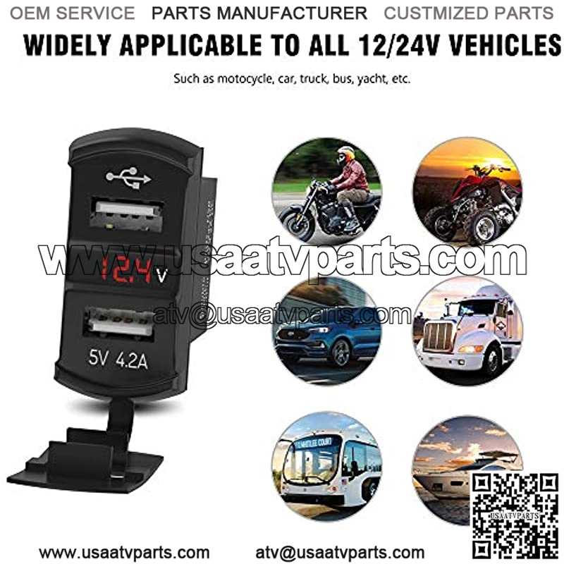 12V/24V USB Charger Socket Rocker Switch Dual USB Car Power Outlet with Red LED Voltmeter Marine Cigarette Lighter Adapter Waterproof 4.2A Fast Charge for Boat Motorcycle ATV RV Truck
