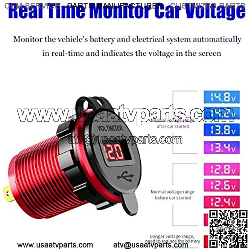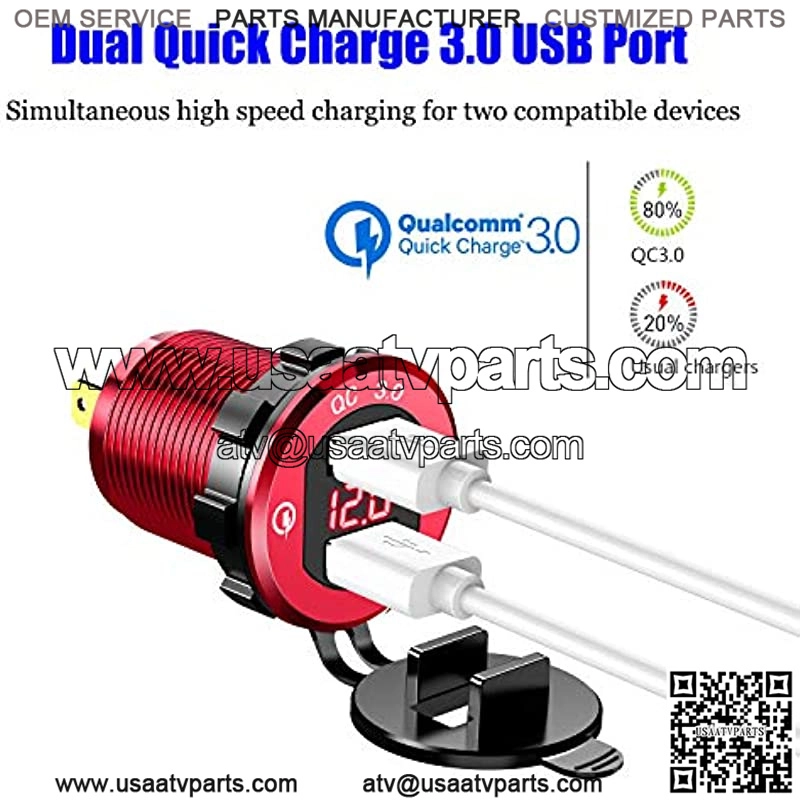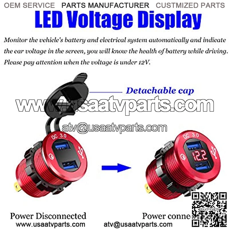 [Aluminum Alloy Material] The advanced full aluminum alloy body with scratch resistance technology keeps it sturdy and lets the 12v USB outlet always look like new. Upgrade metal car chargers will not overheat at high temperatures, which is safer than plastic ones.[Dual QC3.0 USB Ports] With dual supporting QC 3.0 USB ports, the 36W 12-volt USB outlet charges two compatible devices up to 4X faster than conventional charging, backward-compatible with QC 2.0 &1.0. It delivers the fastest possible charge to all non-Quick charge devices.[LED Voltmeter Display] Features a blue LED voltmeter that automatically monitors the vehicle’s battery and the electrical system and indicates the car voltage on the screen. dual USB charger socket will let you know the battery’s health while driving.[Wide Compatibility] Fits for DC 12/24V car, boat, marine, motorcycle, ATV, RV, etc. This USB Socket is suitable for charging iPhones, Samsung, iPad, android tablets, power banks, video game controllers, sport