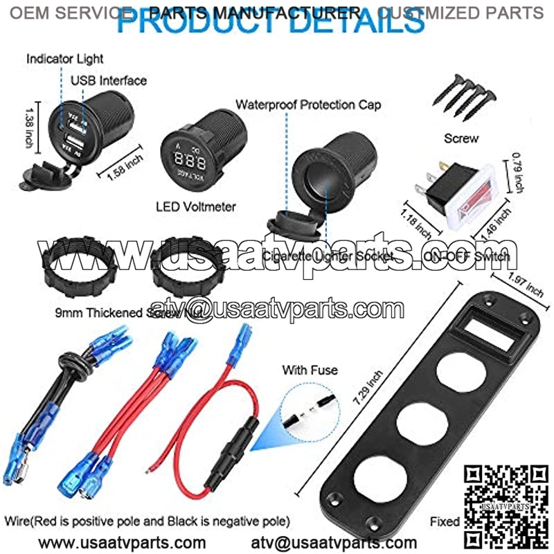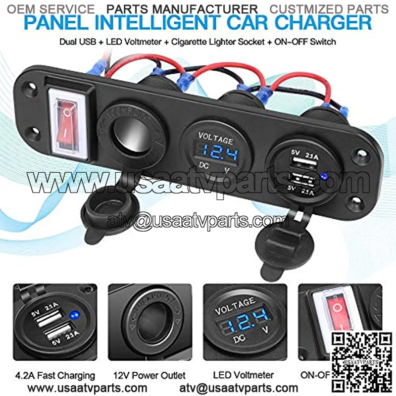 ?4-in-1 MULTIFUNCTIONAL SOCKET PANEL??This charger socket panel is designed with 12v rv usb outlet with LED indicator+ Voltmeter+ 12v cigarette lighter socket+ ON/OFF switch. Detachable DIY design, you can remove the car cigarette lighter socket to replace other charger sockets. All-in-one flexible rotation design of the 12v usb outlet adapter makes it more convenient for you to charge in the car.?WATERPROOF DUAL USB CAR CHARGER??usb charger socket has dual usb adaptive output 5V/2.1A charging ports, which can charge two devices simultaneously. Built-in smart charging IC, it will detect your device automatically and charge at the optimal speed, better charging performance for you to use. Suitable for charging mobile phones, GPS, digital cameras, and other USB-powered devices.?CIGARETTE LIGHTER POWER SOCKET??This 12V waterproof power outlet adapter splitter works with any standard cigarette lighter plug and is suitable for DC 12-24V car, boat, marine, motorcycle, ATV, RV, truck, golf ca