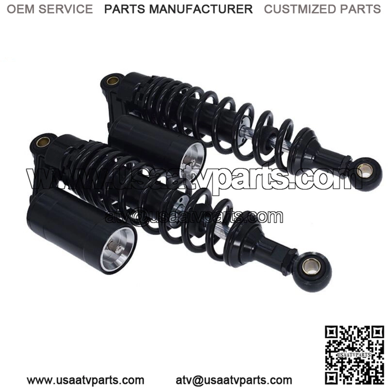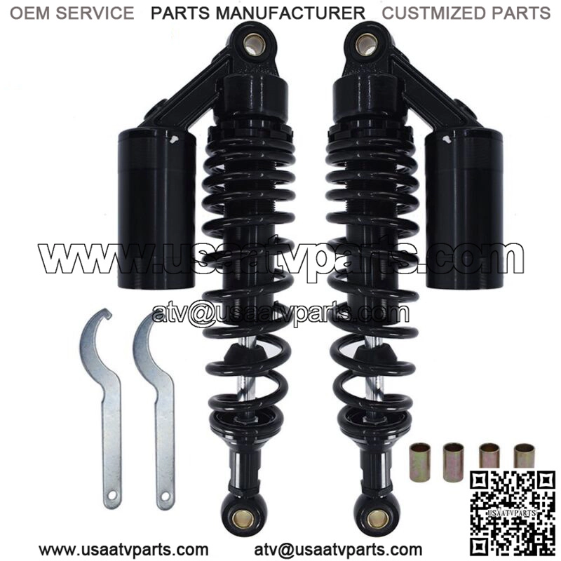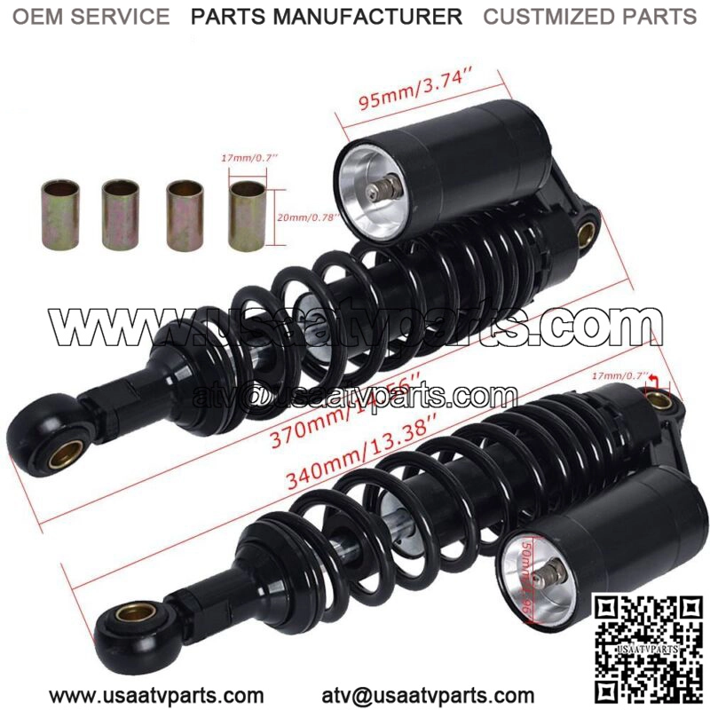 Features:Pressure can be adjusted by springs and air (nitrogen).High quality,high-performance motorcycle parts.The damper and spring designed for long durability.Reduce bumps in the driving of motorcycles.Easy to install.Specification:Product Name: Shock AbsorberColor: Black ??Gold+Black Is Avaiable??Material: Aluminum+IronTotal Length: 370mm/14.56″Eye Core Length: 340mm/13.38″Eye Diameter: 12mm/0.7″Eye Thickness: 20mm/0.78″Spring Thickness: 8mm/0.31″Spring Width: 60mm/2.36″Working Stroke: 68mm/2.67″Factory Air Pressure: 0.4 MpaMaximum Air Pressure: 0.5 MpaAir Reservoir: AdjustablePlacement On Vehicle: Rear,Left, RightQuantity: 2PCSFitment: For work on most 150cc~750cc street bikes, karting(go kart), scooters and moped quad (ATV) with shocks of 340mm eye to eye distance.(Please Compare With Your Original One Before Purchasing!)Package Includes:2 ?? Shock Absorbers2 ?? Eye Cores2 ?? Adjust Spring Tools
