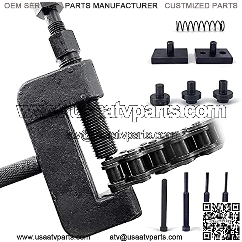 Usage: This tool set could be used as a chain breaker/cutter by pushing the pin out and a riveter to rivet chain links. Supplied with a range of pins and dies. All in one set for chain repairing.