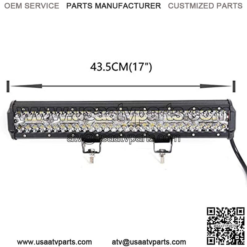 LED Power: 360W,Intensity:12600LM . Operating Voltage: 10-30 DC . Waterproof rate: IP 68 . 120pcs*3w high intensity LEDS . Body Color: Black,White . Color Temperature: 6000K . Material:Diecast aluminum housing . Lens material:PC . Mounting Bracket: Alu firm bracket . Beam: Flood beam pattern(60 degree) 30 degee spot beam optional . 30000 hours above life time . Dimensions:17 inch