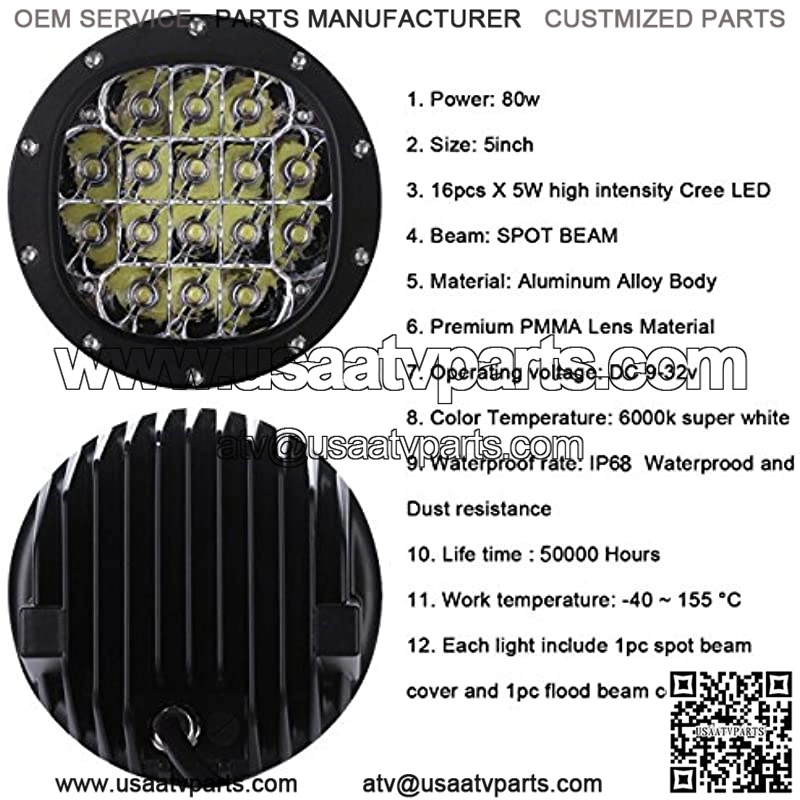 16pcs X 5W high intensity LED; Spot Beam ; Theoretical Lumens Output: 8000 Lm ; Color Temperature:6500K (cool white) ; Operating Voltage:9-32V DC ; Waterproof Rate:IP 68 ; Life Span: 50000+hours ; Working Temperature: -40 ~ 80 ??C . Unique bracket structure, which is aseismatic; High-strength nylon adjustable bracket with gear, which is easy, convenient to ajust the degree and stable. Housing use high-purity die-casting aluminum; Housing surface use the static electricity spurts models processing and isothermal solidifying, which has strong adhesion; Front cover plated by chrome, which can resist strong corrosion. 16pcs X 5W high intensity LED,easy to install and change,80W Led Driving Light use the intensity Led chip,Using unique high transparent anti-glare lens. Package included: 1 pair 80w LED driving light