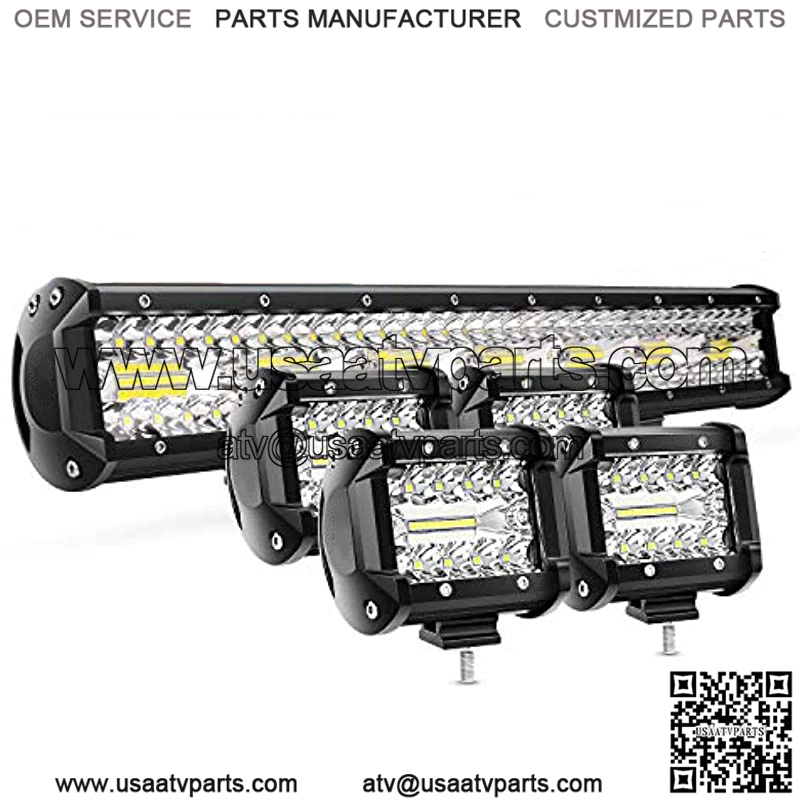 Super brightness: Combo beam with triple row and nest reflector cup design in the middle for extreme light efficiencyAdjustable mounting bracket: the bracket can be adjusted and slid, offering convenience to adjust position flexibly when needed.WATERPROOF RATE: IP67 rated, Seamless protective housing with waterproof glue, great performance of waterproof, dustproof and quakeproof.COMBO BEAM: Appropriate combination of spot beam and flood beam for widespread and further distance illumination.Package includes: 1Pc 420W Combo LED light bar, 4Pc 60W Combo Led Pods and mounting bracketsProduct DescriptionApplications: Off Road Lighting: Jeep, 4×4, Car, ATV, UTV, SUV, Truck, Trailer, Forklift, Train, Boat, Bus, Outdoor lighting, etc. Other Lighting: Excavator, Dozer, Road Roller, Crane, Tractor, Harvester, Grain Drill, Snowplow, Fire engine, Rescue Vehicle, Mining Lighting, Construction Lighting, etc. Household Lighting: Garden, Backyard, Garage, Indoor Lighting. (Note: Use a voltage transfor
