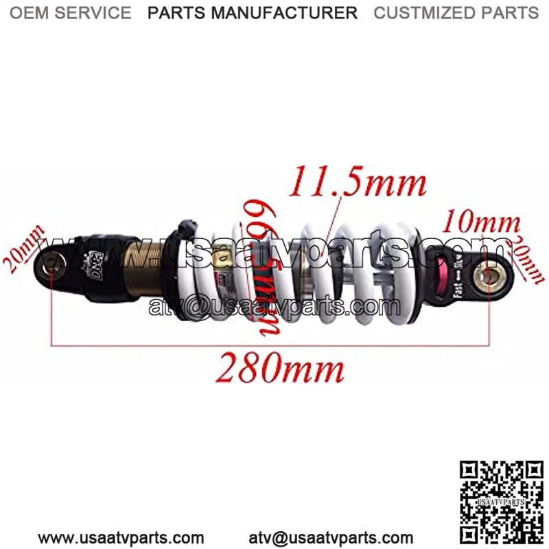 Features: Compatible rear suspension spring/shock absorber. For most Dirt Bike, Quad, ATV, Pit with the length of 280mm. Rod size of 11.5mm and real heavy stuff rating of 850lbs. Comes in White.