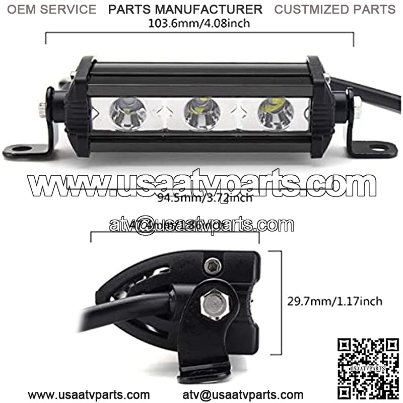 ??Better Design??: Ultra Slim Single Row design,easier and more location to mount so that it’s not only for off-road vehicle but also for SUV. Size: 4 x 1.2 x 1.9 inch(10×4.5×2.5 cm)??High Performance??Quick cooling aluminum alloy heat sinks and high-quality heat conduction silicone gel can effectively extend the lifespan of the light bar to over 30,000 hours, IP67 waterproof, Dust-tight and Shockproof.??10-30V DC Operating Voltage Range??It can apply to different types of trucks, Off-road vehicles,4×4, SUV, Mining, Boating, Farming and Heavy Equipment and more.??USES Widespread Use?? The light bar can be compatible with almost all 4×4, Trucks, Motorcycles, SUVs, ATVs, Cars, Boats, etc. Many indoor and outdoor uses: Garden Lighting, Backyard Lighting, Back-up Light, Off Road Lighting, Construction Lighting and more.??Certifications??CE ,FCC ,IC ,ROHS, IP67 ,Keeping you safe. We provide and lifetime support. We will always be here for you.Product DescriptionSpecification: LED Power: 15W (3 x 5W)