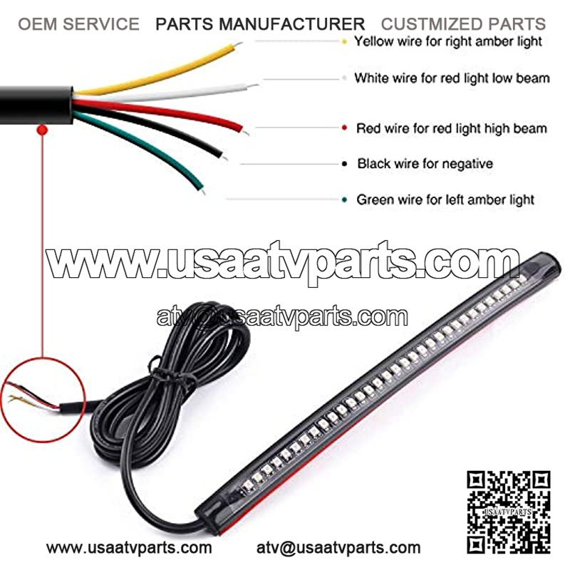 Specification: Length: 7. 6 inch Base Color: Black LED light Color: Red and Amber Voltage: 12V Number of LED: 32 x 3528SMD LED Cable Length: 39 inch Material: Flexible PVC Rubber 5 wires connection Black for Negative, Red for Brake Light, White for Running Light, Green for Left Turn Signal and Yellow for Right Turn Signal. Package Included: 1 X LED Light Strip