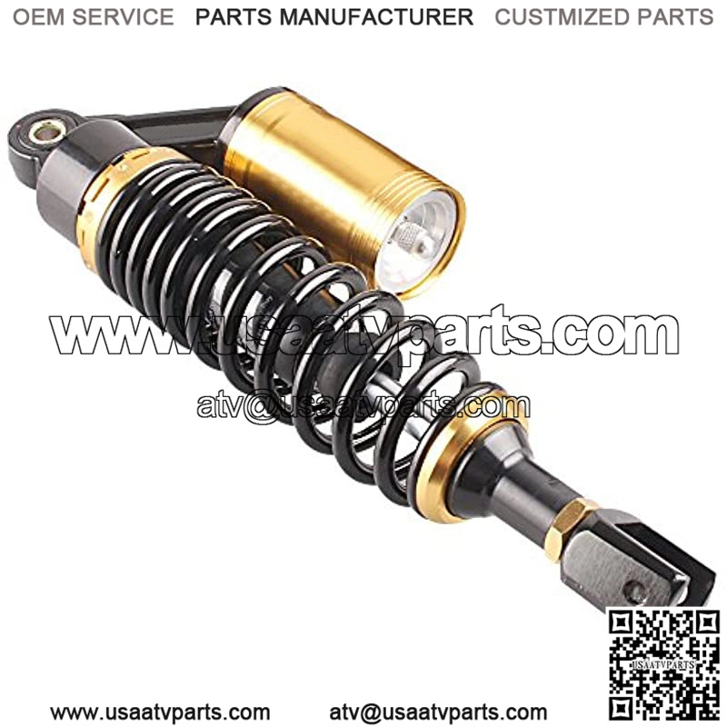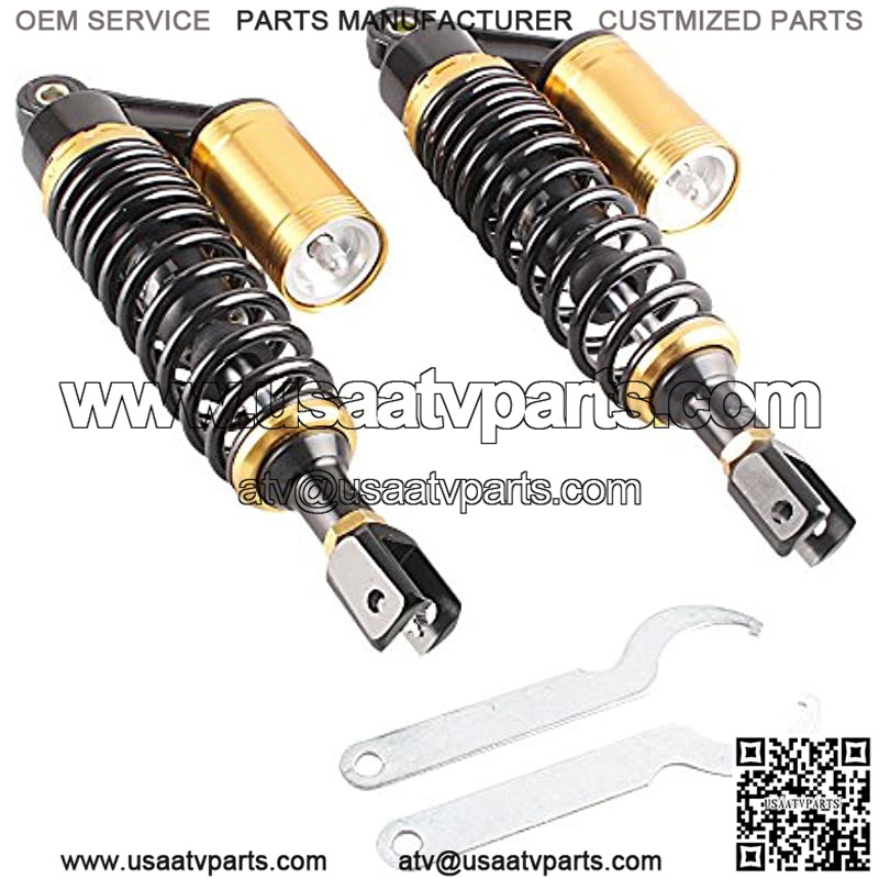 A pair of rear motorcycle shock absorbers, made of quality aluminum and stainless steel;Color: Black & GoldPlacement on vehicle: rear, left, rightHole size: 12mm; Length between holes to clevis: 320mmUniversal for most 150cc~750cc street bikes, Karting(Go kart), Scooters and Moped Quad (ATV) with shocks of 320mm Length of Eye to ClevisClevis Hole Diameter: 8mm Clevis Inner Width: 20mm Clevis Maximum Tensile Strength: 2,000 Kgf Spring Thickness: 7mm Spring Width: 60mm Working Stroke: 60mm Spring Stiffness: 110 kg Maximum load: 200 kg (approx.440 lbs) Factory Air Pressure: 0.4 Mpa Maximum Air Pressure: 0.5 Mpa Universal fits for most 150cc~750cc street bikes, Karting(Go kart), Scooters and Moped Quad (ATV) with shocks of 320mm eye to clevis distance. Please kindly check the specific size above before placing the order to confirm it can fit for your vehicle. We are professional auto parts company which focus on the desi