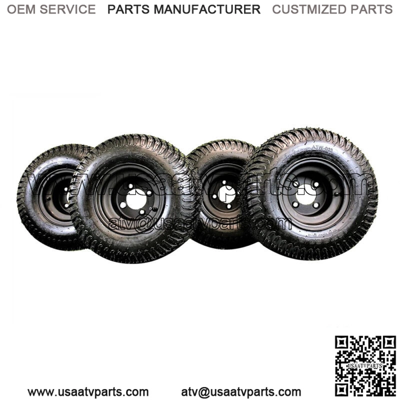 Your order will include: (4) New 18×8.50-8 Golf Cart Turf Tires (comes mounted on the wheels) (4) New 8×7″ Black Steel Golf Cart Wheels Shipped together in a heavy weight corrugated box for added protection.Fits ALL Golf Carts: EZGO: Marathon / Medalist / TXT /ST / PDS / RXV / Workhorse Club Car: DS / CARRYALL / PRECEDENT Yamaha: All G MODELS / DRIVE(G29) Other golf carts: Any bolt pattern that is 4×4 **These assemblies fit any Golf Cart, Lawn Mower, UTV, ATV, or Trailer hub that is 4 bolt and measures 4×4″ (4×101.6mm)**Product DescriptionSet of 4 Tire and Wheel Assemblies *** Wheel Color: Matte Black *** Wheel Size: 8×7 *** Pilot Hole: 2.83″ *** Number of Bolt Holes: 4 *** Bolt Hole Size: .590″ *** Bolt Circle: 4″ *** Offset: Centered *** Tire Size: 18×8.50-8 *** 4 Ply *** Tread Code: ATW-003 *** Non-Directional *** Tire OD: 17.7 Nom *** Tire SW: 8.3 Nom *** PSI: 22 *** Load Rating at 10 mph: 815 lbs..