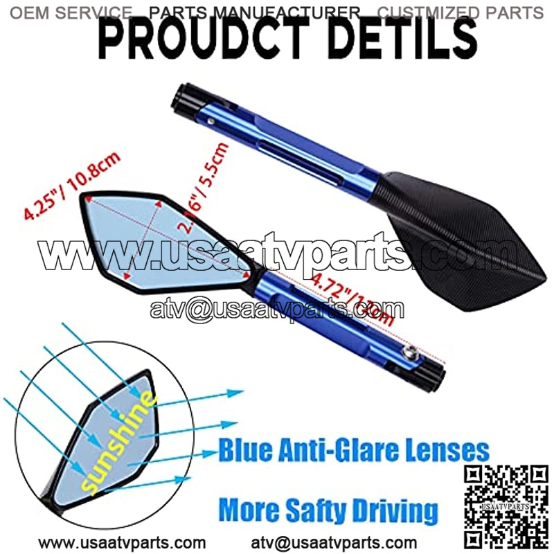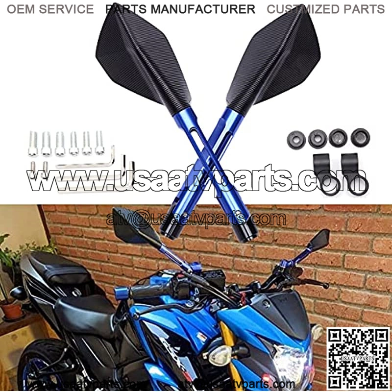 FEATURES:Unique Charming Look with Streamline Design, Special Shape Makes your Motorcycle more Eye-Catching In The Road.Blue Anti-Glare Lenses Make your Driving Safer under The Sun.Rear Glass Provides you a High Definition and Wider Vision, Easily seeing the Upcoming Cars and Obstacles.