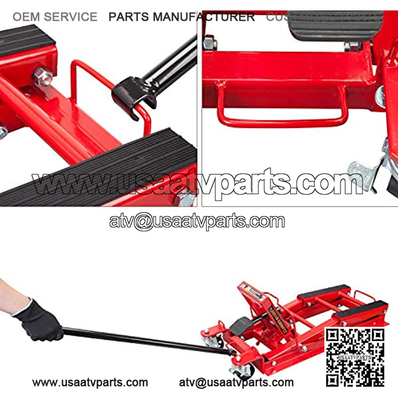 “The Torin BIG RED T64017 service jack is the ideal solution to your motorcycle, snowmobile, ATV, and UTV lifting needs. It features a lifting range of 5-1/8″ to 16-1/8” with a 3/4 ton (1,500 lb) load capacity. This wide-load bearing jack is intended for the powersports enthusiast for maintenance or even lifting for off-season storage. The Torin BIG RED T64017 service jack is equipped with 6 locking positions and includes 2 locking swivel casters, a bottle jack, and a pulling bar. The powder-coat finished exterior provides long-lasting durability..