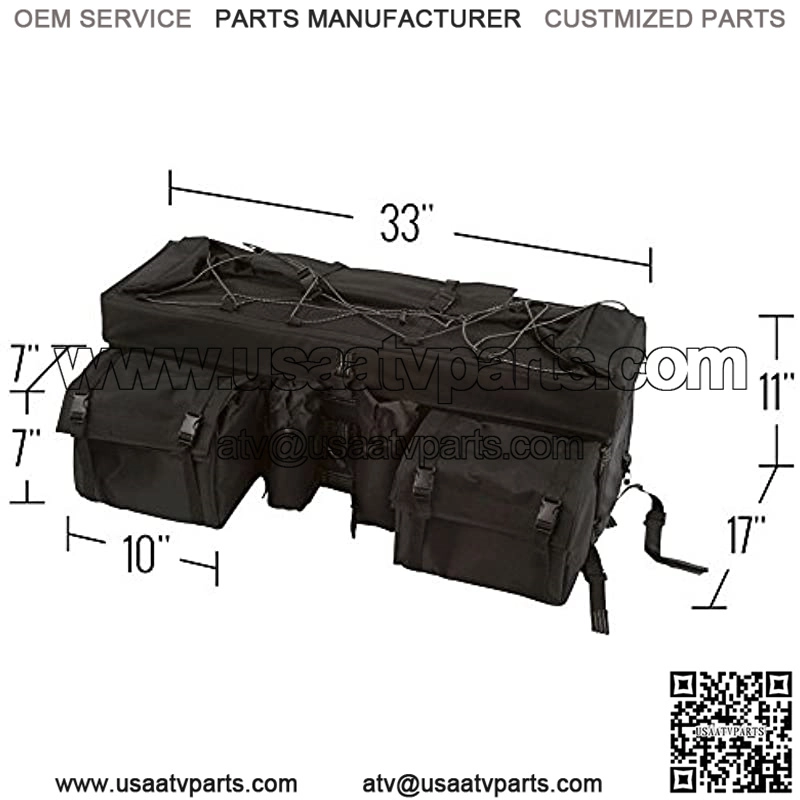 Bring extra gear hunting, while on the trail, or to the next favorite outdoor destination with a rugged, durable black ATV rear rack cargo bag. Keeps items organized in a multiple compartment main storage area created with hook and loop dividers, along with outside-attached compartments, and beverage holsters. The main storage area measures 33″L x 10″W x 11″H overall. (2) Removable storage bags each measure 10″L x 7″W x 7″H and are secured to the main compartment with snap buckles. (2) Drink holders each measuring 3″D x 6″H, great for carrying most traveler mugs, bottles or can beverages. Each rear ATV bag includes (6) integrated adjustable tie-down straps for securing to a rear ATV rack and a to