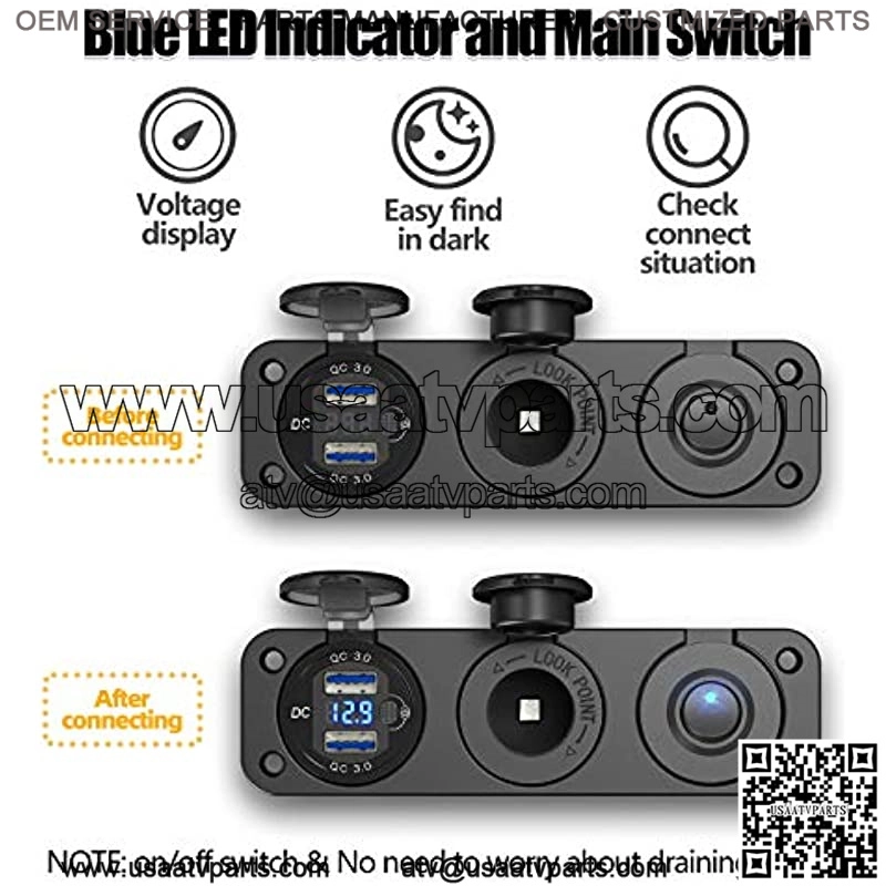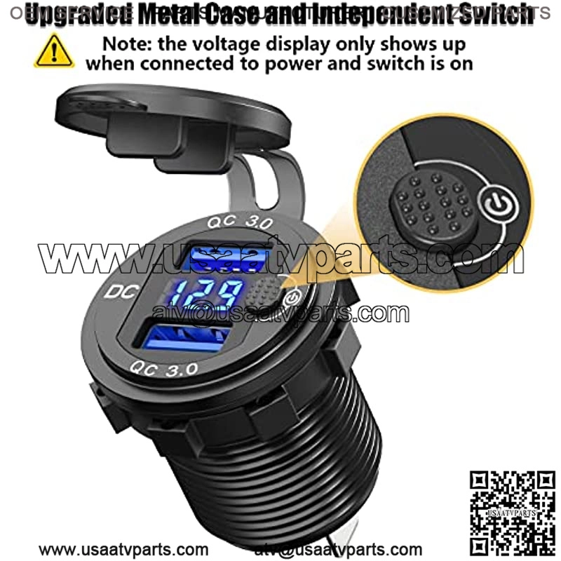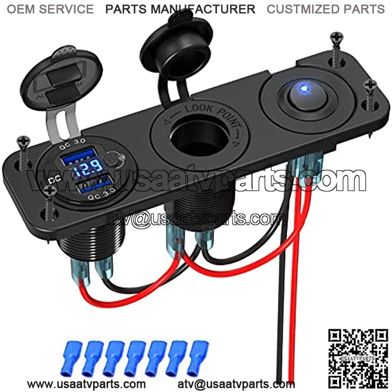 ??3 in 1 Cigarette Lighter Splitter??The cigarette lighter panel kit includes an upgraded aluminum metal 12V USB socket with LED voltmeter & ON/Off button switch, high-power 150W cigarette lighter socket and LED rocker toggle switch. 3 in 1 compact design, saving space.??Metal 36W 12V USB Outlet??Dual QC 3.0 USB ports provide 4x faster charging speed to compatible devices. And this usb outlet features a switch met the customer need which can save power and prevent the battery being drained when leave unused.??150W High-quality Socket??Fits for 12-24V car, boat, marine, motorcycle, ATV, RV, riding mower, tractor etc. Suitable for charging USB car charger, GPS, digital camera, dash cam and other accessories.?? Independent Toggle Switch??This charger panel designed with an independent ON/OFF rocker switch, which controls the 12v USB outlet and cigarette lighter socket, saving more electricity and expands the product??s lifespan.??Our Promise??We are a professional car charger company, providing you