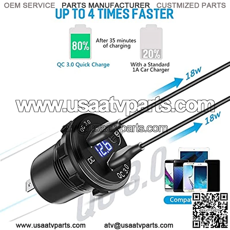 What You Will Get: 1x aluminum metal 12V USB socket with Voltmeter; 1 x high-power 150W Cigarette Lighter Socket; 1 x Blue Toggle Switch; 4 x Screws with 2years warranty and lifetime technical supports.DUAL QC3.0 USB PORTS: Upgraded high-quality Dual QC 3.0 12V USB outlet helps charge two compatible devices simultaneously up to 4X faster than conventional charging. Works perfectly with any DC 12V/24V car-powered devices: car, Boat, Marine, ATV, RV, etc. Suitable for charging mobile phones, GPS, digital cameras, PDA, and other USB accessories.CIGARETTE LIGHTER SOCKET: Expanding the cigarette lighter socket, total output up to 120W(12V) / 150W(24V). Enough for simultaneous use of a variety of portable appliances in your vehicle.FEATURES SWITCH&LED DISPLAY: You can turn off the car cigarette lighter through a toggle-led switch to save power and prevent the battery when not in use. The blue light will let you know if your device is in charge. The soft, unobtrusive LED ring helps you find y