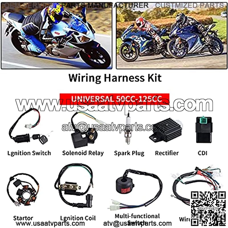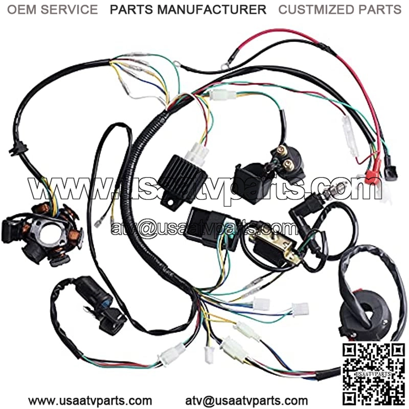 This is a complete electric start engine wiring harness loom,include 1x ATV Wire harness,1x CDI(5Pin AC),1x Solenoid Relay,1xRectifier (Voltage Regulator) ,1x Ignition Switch (2 keys, waterproof),1x Upgraded Multi-functional ATV Switch,1x Stator (Magneto Generator),1x Ignition Coil with lead, 1x Spark plug.