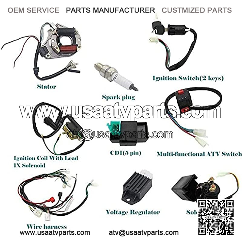 This is a complete electric start engine wiring harness loom,include 1x ATV Wire harness,1x CDI(5Pin AC),1x Solenoid Relay,1xRectifier (Voltage Regulator) ,1x Ignition Switch (2 keys, waterproof),1x Upgraded Multi-functional ATV Switch,1x Stator (Magneto Generator),1x Ignition Coil with lead and 1x Spark plug.Good value for money,easy for replacement.