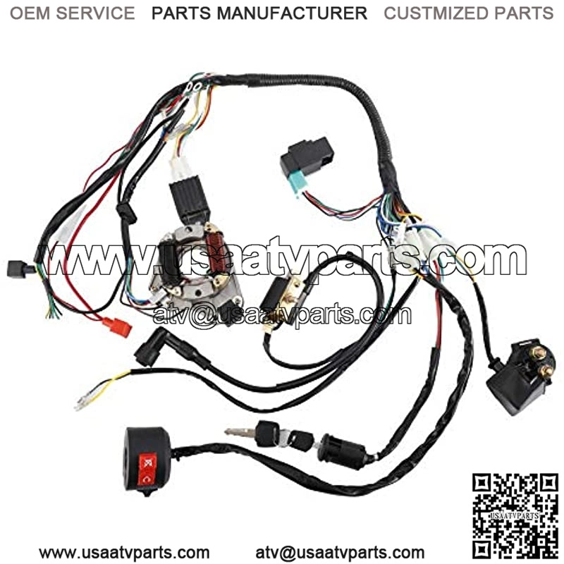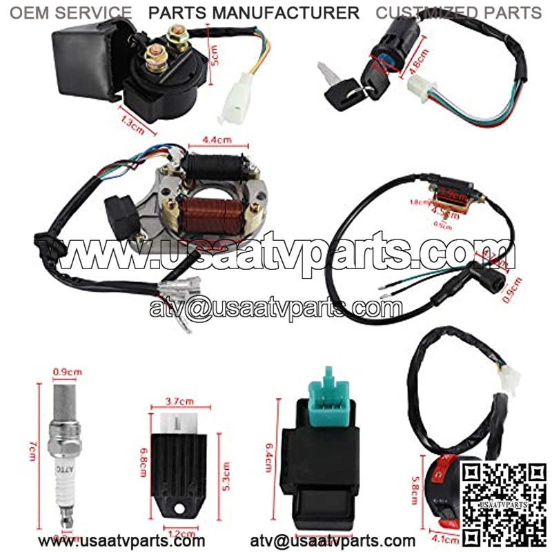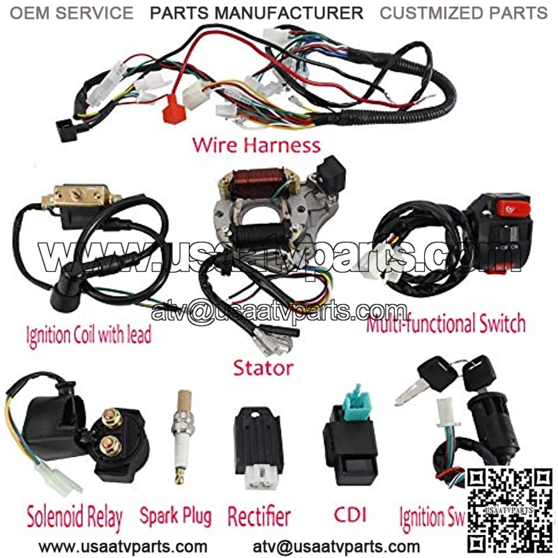 ??Electric Wiring Harness Kit??: A complete set of electric starter coil wiring harness kit, includes a Wiring Harness, a CDI(5Pin AC), a Spark Plug, an Ignition Coil with Lead, a Solenoid Relay, a Rectifier, an Ignition Switch (2 keys, waterproof), an Upgraded Multi Functional Switch and a Stator (magneto generator).