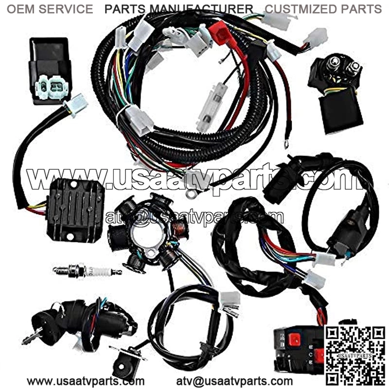 Package includes: 1x GY6 125cc 150cc Wiring harness, 1x CDI, 1x Spark Plug, 1x Ignition Coil With Lead, 1x Solenoid Relay, 1x Rectifier (Voltage Regulator), 1x Ignition Switch (2 keys, waterproof), 1x Upgraded Multi-functional ATV Switch, 1x MAGNETO Stator (6 Pole 5 Wire, 2 fixing holes) COMPLETE ELECTRICS GY6 125CC 150CC WIRE LOOM MAGNETO STATOR ATV QUAD WIRING HARNESS