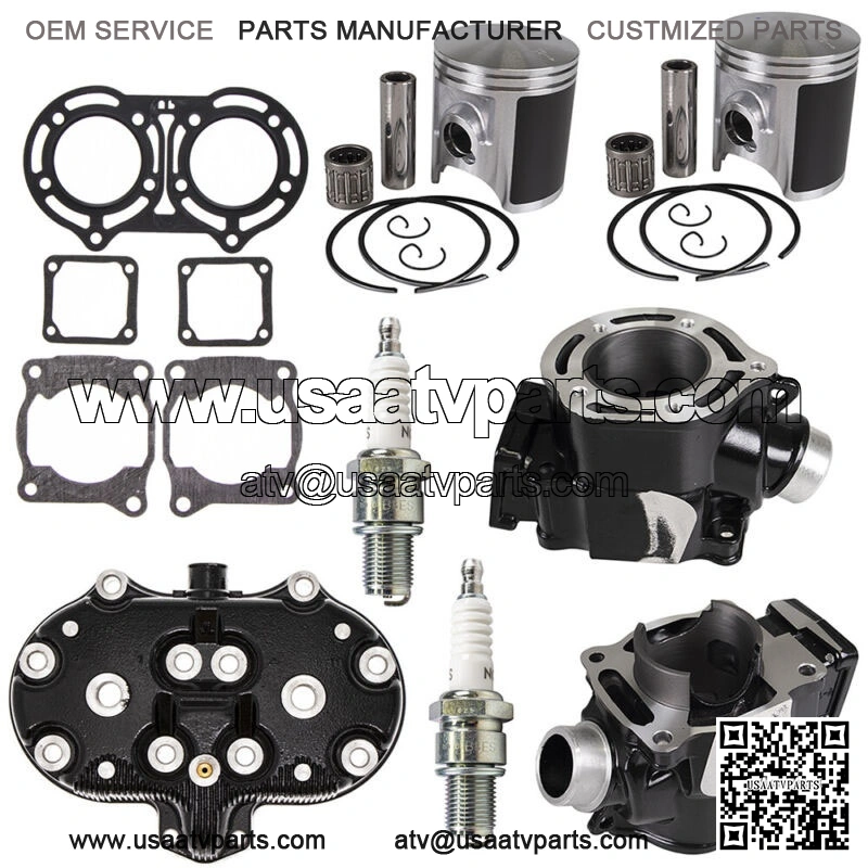 Includes: Left Cylinder, Right Cylinder, Cylinder Head Pistons (2), Piston Rings (2), Wristpins (2) Circlips (4), Needle Bearings (2), Head Gasket, Base Gaskets (2) Valve Seat Gaskets (2), Spark Plugs (2)