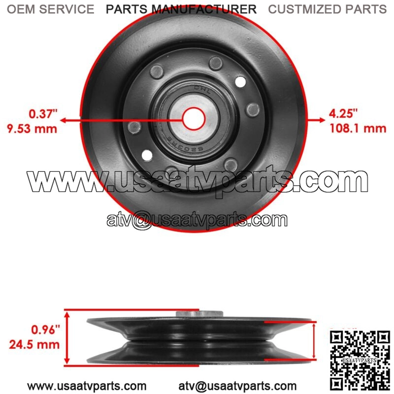 1 x Deck Idler Pulley | 146763 173902 532146763Inner Diameter : 9.53mm | 0.37″Outer Diameter : 108.1mm | 4.25″Width : 24.5mm | 0.96″