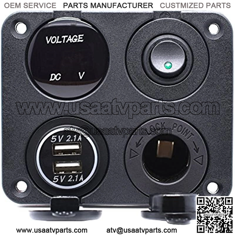 DIY Four Hole Panel Base; Dual USB Socket + Voltmeter + 12V Outlet + Toggle Switch.USB socket output: DC 5V / 4.2A; Power outlet: DC 12V; Voltmeter display range: 0 – 24V.Small size and excellent performance.Easy to install, convenient to use.Widely used for car, truck, Rv, ATV, boat, etc.About the switch hole, It could be used for a cigarette.Can Not be used to light cigarettes.If you don’t need the switch for a while. So enjoy it depend on what you wold like it to be. It has two different use, why not ordering it nowPackage includes: 1x Cigarette Lighter Socket + 1x Green LED Voltmeter + 1x Green Dual USB Charger + 1x Green Round Toggle Switch + 9 x Insulated Terminals + 4 x Screws (Not Included Connection Wires).Flexible design; DIY Four Hole Panel Base; Dual USB Socket + LED Voltmeter + 12V Power Outlet + Toggle Switch; Can be freely interchangeable, also can replace any port with additional USB outlets, or anything else that fits. Specification: Color: Black Material: ABS US