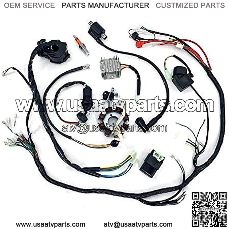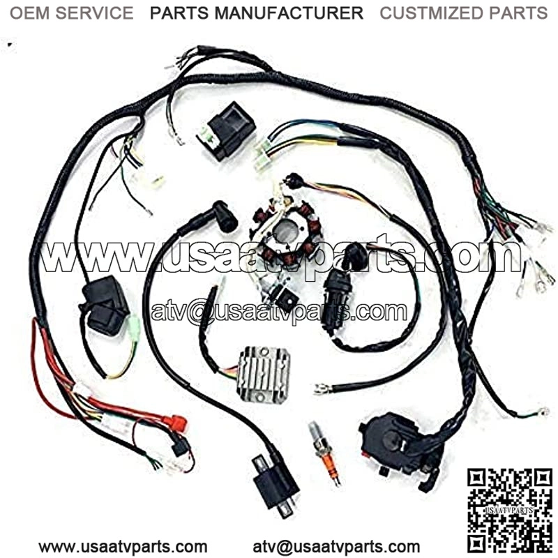 This kit includes: Wiring Loom Harness,ATV Switch,Key (Ignition) Switch,Spark Plug,CDI,Ignition Coil,Solenoid Relay,Rectifier, Stator. Easy to replace,good value for money.