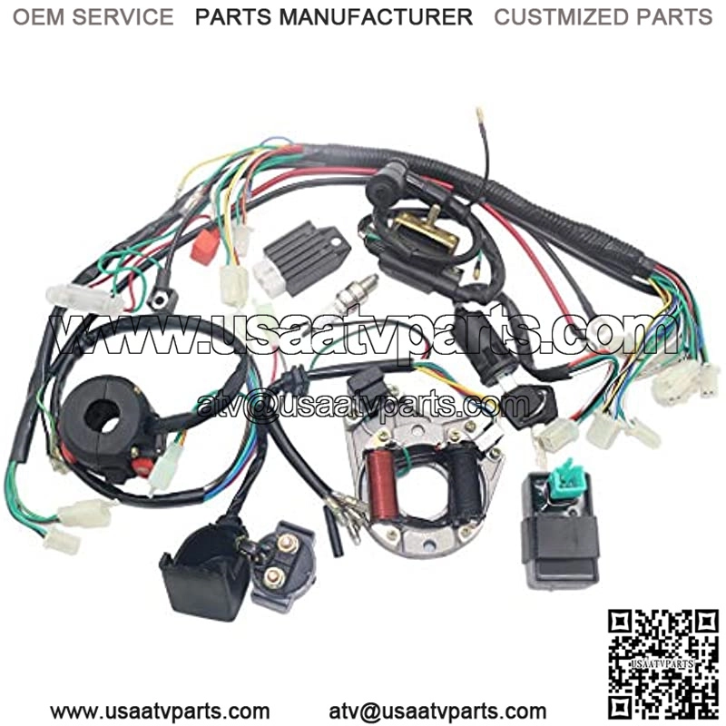 Complete electric start engine wiring harness loom, include: 1x ATV Wire harness, 1x CDI(5Pin AC), 1x Solenoid Relay, 1xRectifier (Voltage Regulator) , 1x Ignition Switch (2 keys, waterproof), 1x Upgraded Multi-functional ATV Switch, 1x Stator (Magneto Generator), 1x Ignition Coil with lead and 1x Spark plug Complete Electric Start Engine Wiring Harness Loom