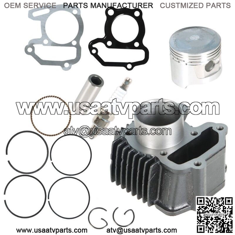 Includes: Cylinder, Piston, Piston Rings, Wristpin, Circlips (2), Head Gasket, Base Gasket, Spark Plug