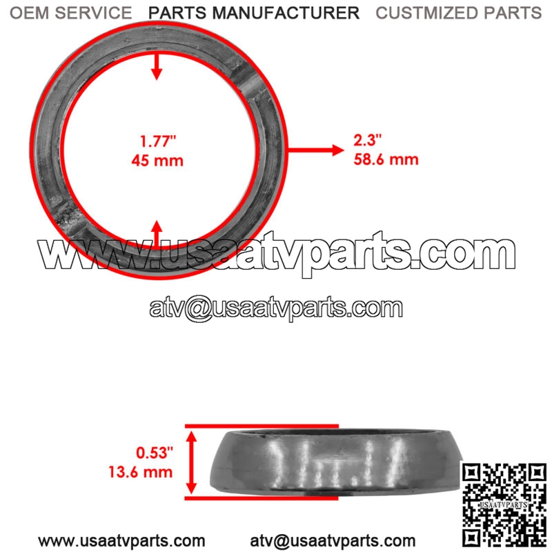 Premium Quality Replacement PartExhaust Socket Seal GasketFor Polaris Models:RANGER 800 2013-2017Order Includes: 1x Exhaust Socket Seal Gasket | 3610209 Inner Diameter : 45mm | 1.77″Outer Diameter : 58.6mm | 2.3″Width: 13.6mm | 0.53″**
