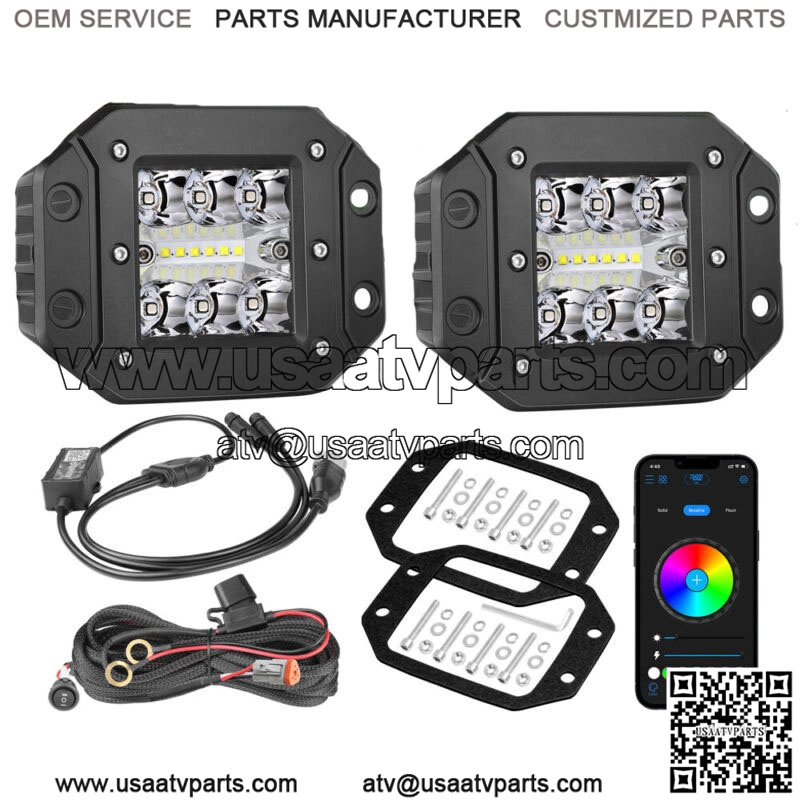4inch RGB Strobe & White Flush Mount LED Lights ,Total of 120W at 7,000K Color Temperature,Lighting the entire forward viewing area,which will give you excellent visual effect and comfortable and safe driving experience. RGB strobe effect controlled by Bluetooth APP on Android or iPhone, support RGB light effect Sync with music rhythm in music mode, support DIY light effect. It can light up your dark road, wider your vision and perfect for various Truck show such as offroad race, fleet parade, beach feast and music show.