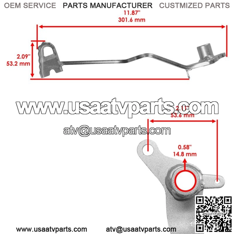 Premium Quality Replacement PartForged Rear Brake Pedal LeverFor Yamaha Models:Banshee 350 YFZ350 1987-2006Order Includes:1 x Brake Pedal | 3GG-27211-10-00 2GU-27211-00-00 3GG-27211-00-00Width: 53.2 mm | 2.09″Length: 301.6 mm | 11.87″ Inner Diameter: 14.8 mm | 0.58″Mounting Hole Distance: 53.6 mm | 2.11″Weight: 13.5 oz1 x Tension Spring | 90506-20380-00**