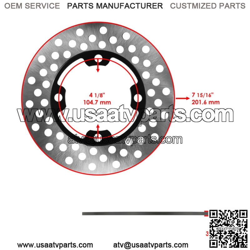 Front Inner Diameter: 4 1/8″ | 104.7mmFront Ourer Diameter: 7 15/16″ | 201.6mmRear Inner Diameter: 4.96″ | 126mmRear Outer Diameter: 8 5/8″ | 219mmFront Disc Thickness 0.15″ | 3.9mmRear Disc Thickness 0.13″ | 3.45Front Brake Pad Thickness 0.3″ | 7mmRear Brake Pad Thickness 0.4″ | 9.5mm Order Includes:2x Front Brake Rotor Disc