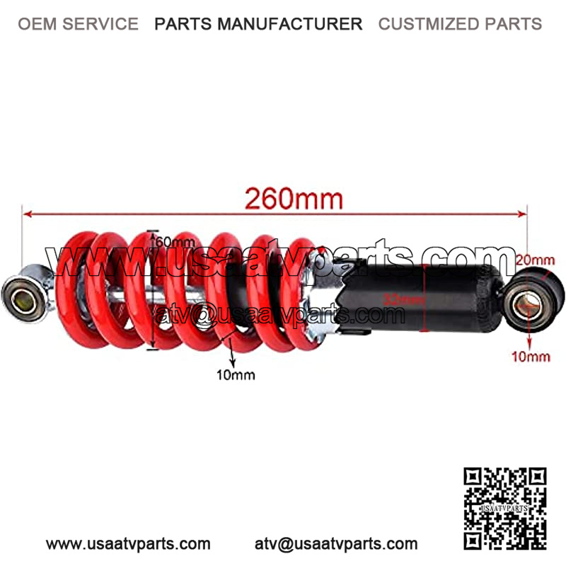 Impact grade 400lb, 260mm or 10.2 “eye to eye, inner diameter 10mm, suitable for 50cc-150cc off-road vehicle, pit car, ATV, go kart and motorcycle.