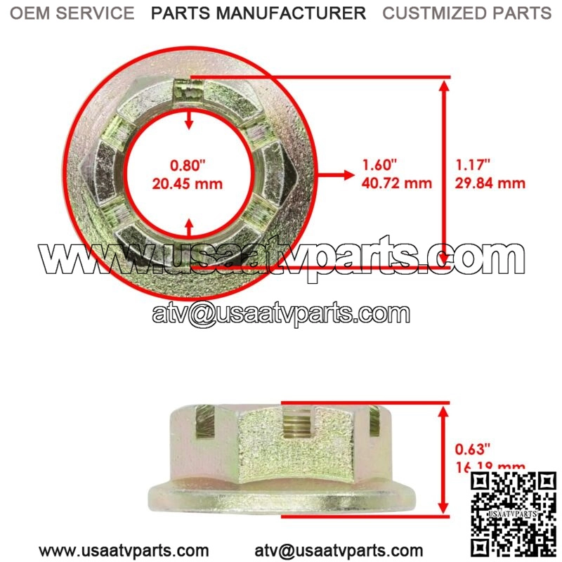 4 x Castle Nut | 0423-607Width : 16.19mm | 0.63″Inner Diameter : 20.45mm | 0.80″Outer Diameter : 40.72mm | 1.60″