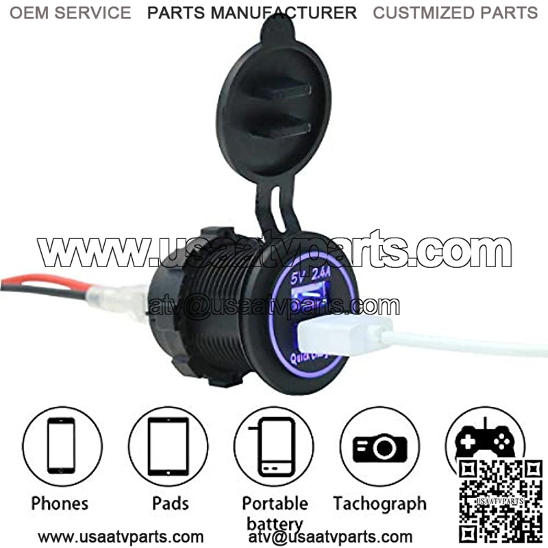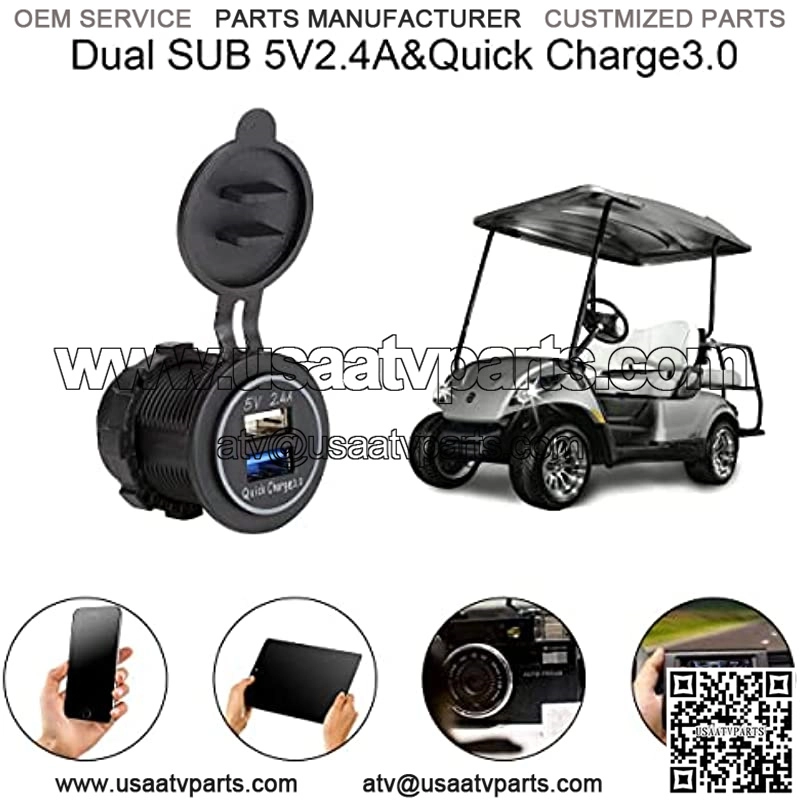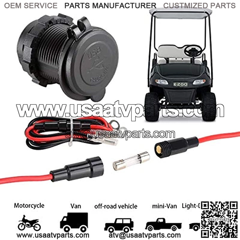 High Quality Dual USB Charger Socket,waterproof power outlet widely used with electric equipments for power supply: mobile phones,tablets,GPS, cameras, power bank and so on; This USB charger socket is especially designed for using with DC power vehicle like Golf Cart, also for Car, Truck, Boat,Motorcycle Marine or RV; Made with flame retardant material, Waterproof & Dustproof,Overpower protection: 10A inline fuses to protect your plugs from being overloaded,charge your phone steadily & safely as fast as possible;; Max Output Current:5.4A (2.4A+3.0A); DC 12Volt~ 24Volt Input ,DC 5V Output,stable current and voltage,much safer than cheap ones on the market; Easy to mount,drill a 1.1?? hole on dash,Put the socket into the hole and screw it tightly,Connect”+” to battery positive pole and “-” to negative pole,then installation finished;About Us:is a professional golf cart accessories brand having been concentrating on golf cart accessories (incl.refit parts&upgrade parts)fo