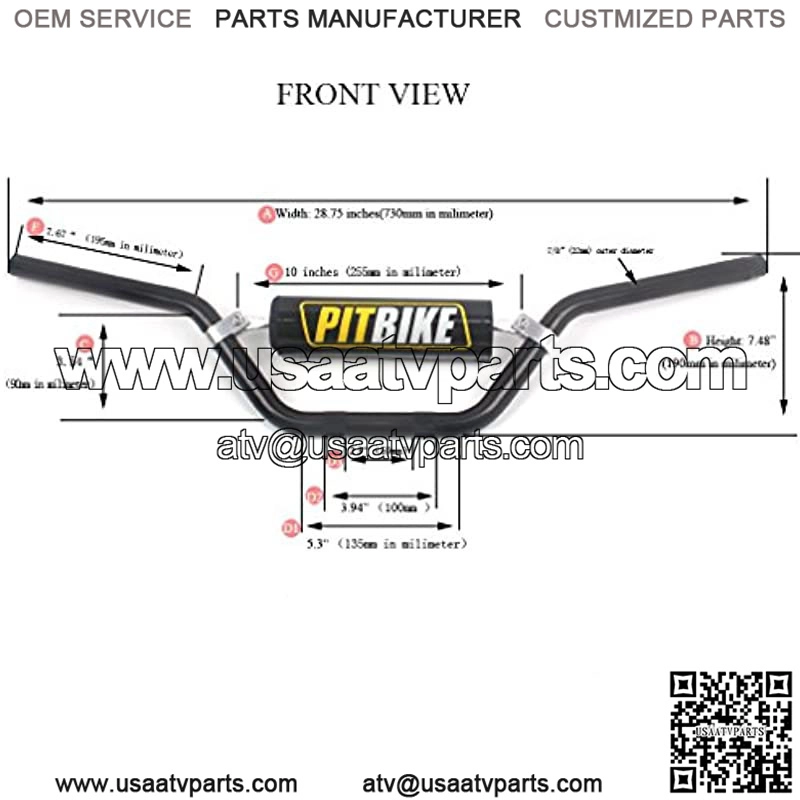This is a 7/8″ dirtbike handle bar with foam pad and extra 304 stainless steel bolts.There is a 5mm inner diamter right switch mounting hole. Please look at picture for detail measurements.