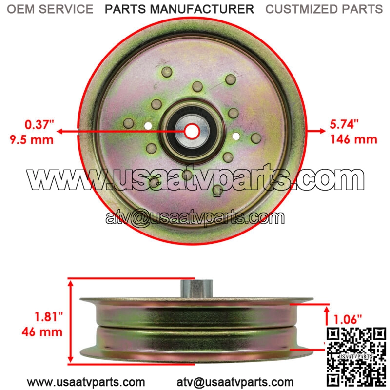 ID: 0.37″ | 9.5 mmOD: 5.74″ | 146 mmHeight: 1.81″ | 46 mmHeight Idler Pulley: 1.06″ | 27 mm