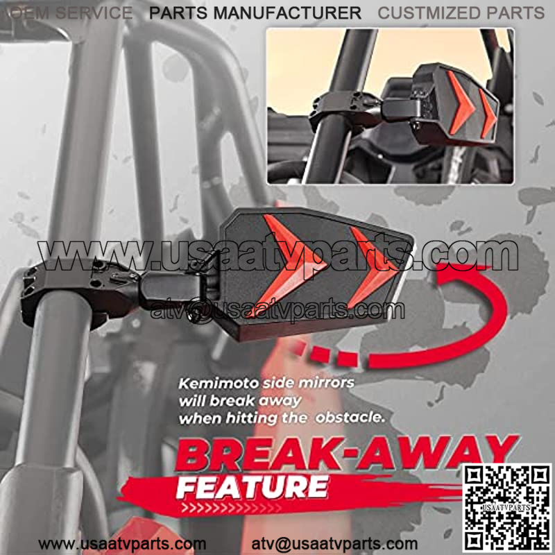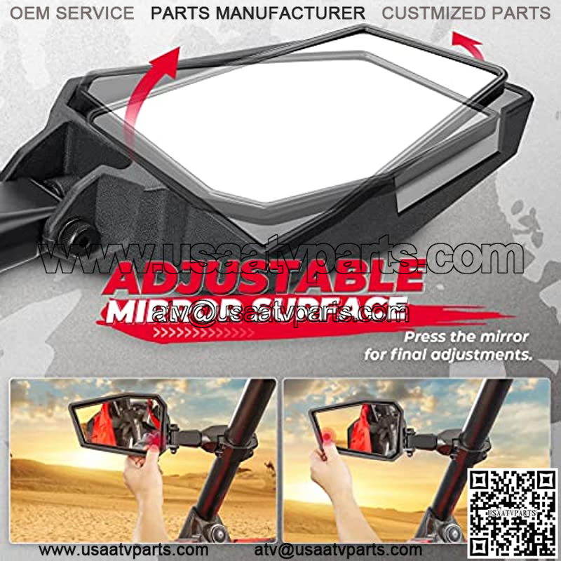 Break Away Feature: UTV Side Mirrors can adjustable 180?? and fold back when the mirror hits a tree or obstacle, reducing the risk of smash.you can adjust the angle by pressing the glass like a car rearview mirror to meet your different angle needs.