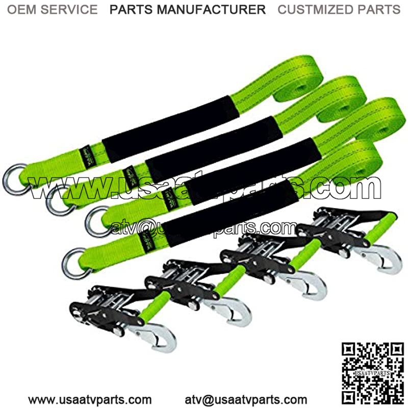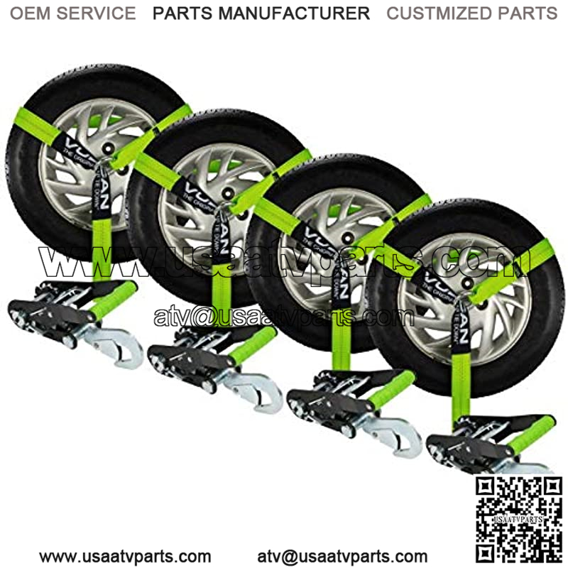 Professional operators choose Vulcan automobile tie down systems to haul millions of vehicles every yearVulcan is recognized as the most qualified, most experienced, car tie down manufacturer in the worldEasily trailer any car, truck, SUV, or sports carDesigned for use on flat bed trailers, wheel lifts and tow dolliesStraps feature a universal loop design that self-adjusts to fit most tiresThe ”lasso style” harnesses with smooth O-rings work with flat bed trailers and many popular wheel lifts and tow dolliesUltra-bright neon green straps are extremely visible in daytime light conditionsSpecial retro-reflective fibers shine brightly at night for extra visibility in low light conditionsCertified polyester tie down webbing is coated for UV and cut resistanceEach strap has a plated O-ring and a cordura wear pad for maximum security and minimum rim damage