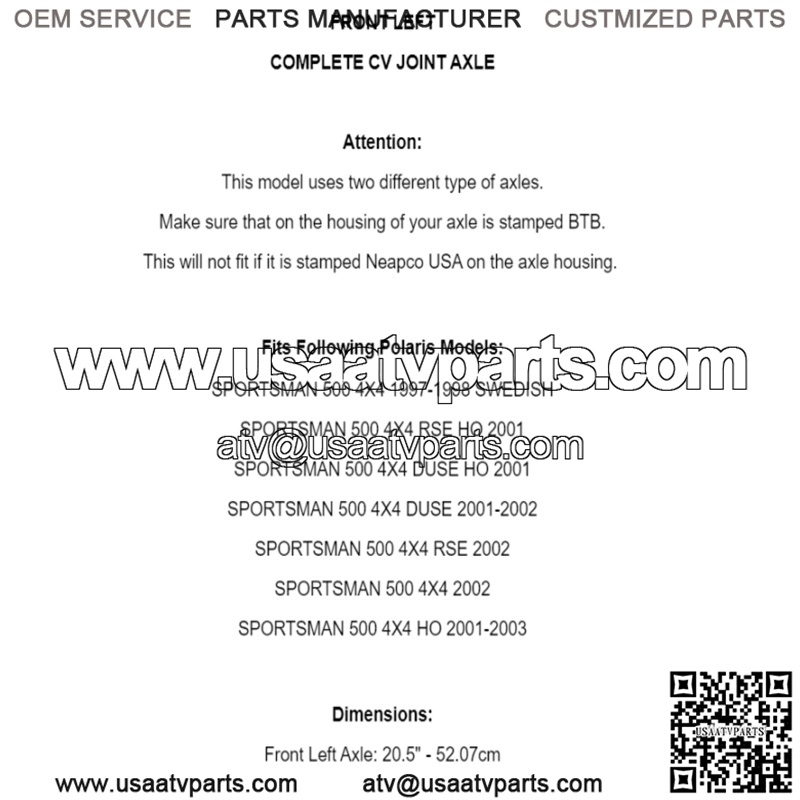 This model uses two different type of axles.Make sure that on the housing of your axle is stamped BTB.This will not fit if it is stamped Neapco USA on the axle housing.