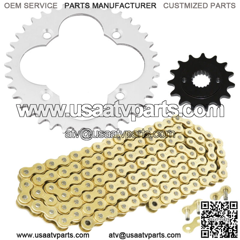 The chain comes in standard 120 Links1. Drive Chain with Master Link and Rivet Link (Tensile Strength 6000 pounds)2. Front Sprocket 15 Teeth / Material: Steel 3. Rear Sprocket 38 Teeth / Material: C49 High Carbon Steel
