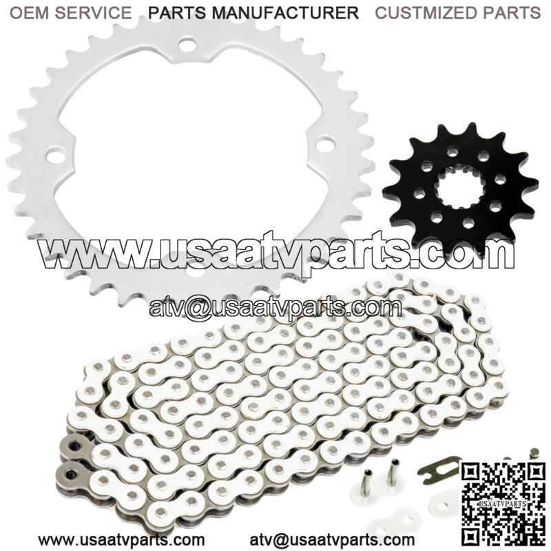 The chain comes in standard 120 Links1. Drive Chain with Master Link and Rivet Link (Tensile Strength 6000 pounds)2. Front Sprocket 14 Teeth / Material: Steel 3. Rear Sprocket 38 Teeth / Material: C49 High Carbon Steel