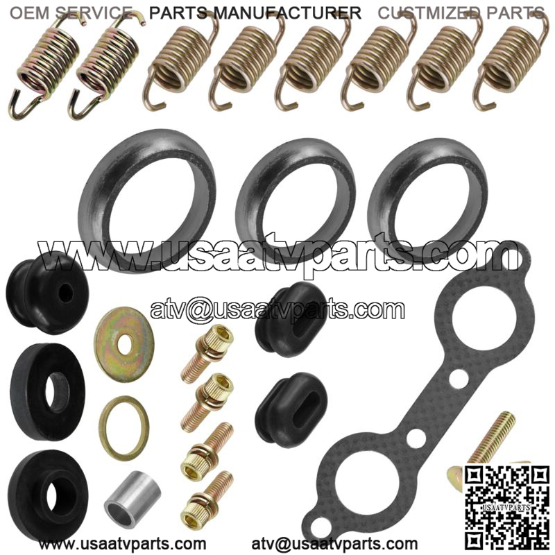 Order Includes:1x Nut5x Bolt8 x Muffler Spring3x Silencer Mount Grommet1x Exhaust Gasket3x Exhaust Pipe Gasket 1 x Dampener Vibration3x Washer1x Bushing