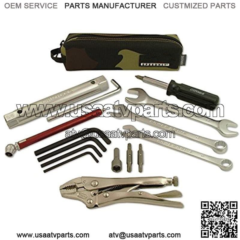 This ultra-compact tool kit is packed with functionality for off-road motorcycles, dirt bikes, UTV, and ATV. The kit includes wrenches to cover most common metric fasteners, 4-in-1 screw driver, nut driver, torx bits, hex keys, locking pliers, 2-in-1 spark plug socket and 0-20psi tire gauge in a durable zipper pouch. The Off-Road speed kit is similar to the Metric kit, but with locking pliers, 10 & 12mm combination wrenches, and low-range tire pressure gauge. . Kit Contents: 14 x 17mm Open End Wrench, 12mm Combination Wrench, 10mm Combination Wrench, 8mm Nut Driver, 5/8?? & 18mm Combo Spark Plug Wrench w/ lever, Mini 5-in-1 screwdriver w/ Torx T20,25,27,30 bits, Hex Keys: 3,4,5,6mm, 0-20 psi tire gauge, Locking Pliers, & Heavy-duty zip-up pouch