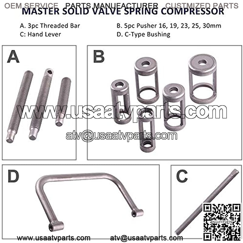 PACKAGE INCLUDES: 1x Valve Spring Compressor C Clamp; 5x Spring Compressing Adapters; 3x Threaded Posts; 1x Rod; 1x Carrying Case