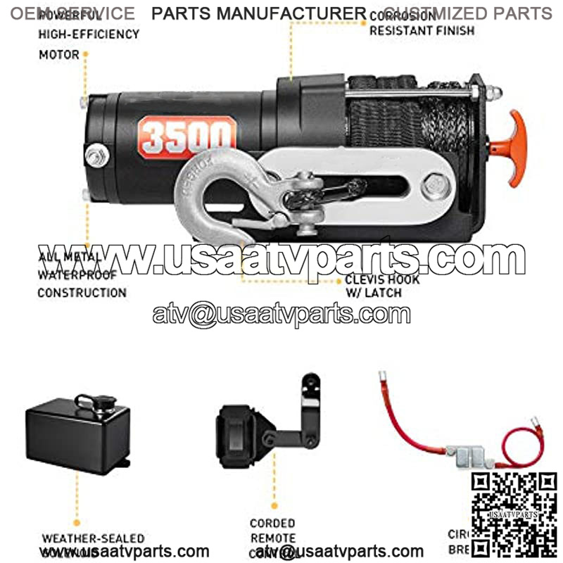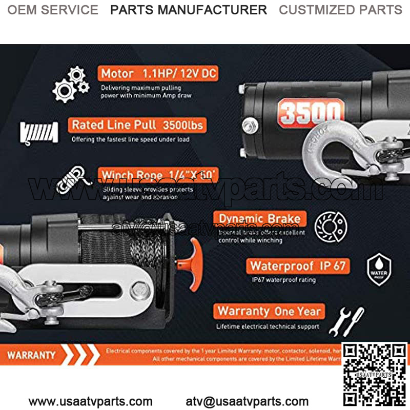 [ENDURING] The Zeak 3500lb. powersports winch provides a 1.1 hp 12V DC permanent magnet motor which drives a strong and steady pull. The reliable dynamic brake prevent the rope from sliding while loading.