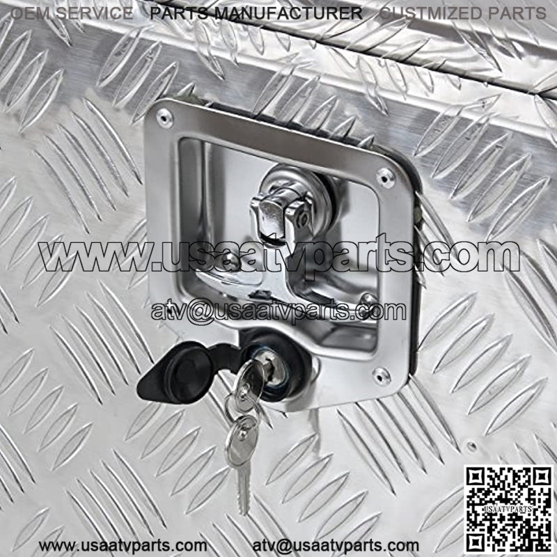 Our tool box is designed to save space and provide extra storage under your truck bed. This tool box is constructed of textured aluminum for maximum durability. The door is reinforced with a weather-resistant seal for keeping your tools and items dry and safe. Fold down door provides full access. Built-in lock ensures all items are kept safe and secure. This aluminum underbody tool box is perfect for storing your tools in your vehicle or at home. Features