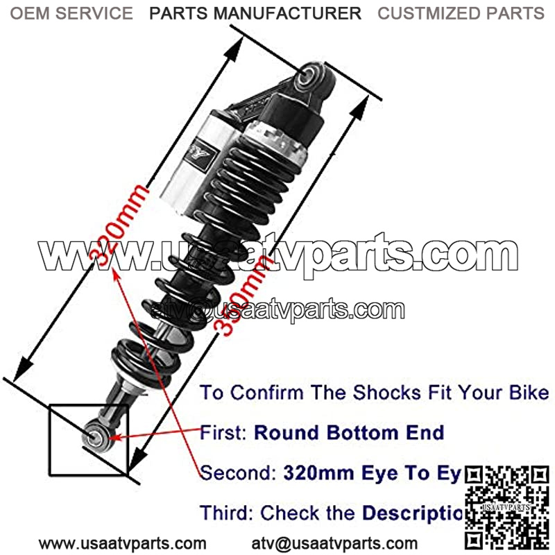 Universal Fit Street Bike, Scooters, ATV, Go Kart Shocks. Work perfectly on most 150cc~750cc street bikes, Scooters and Moped Quad (ATV) with shocks of 320mm eye to eye distance. Great choice for replacement, style upgrading and all kinds of bike modification. **Please check below dimension before bidding.